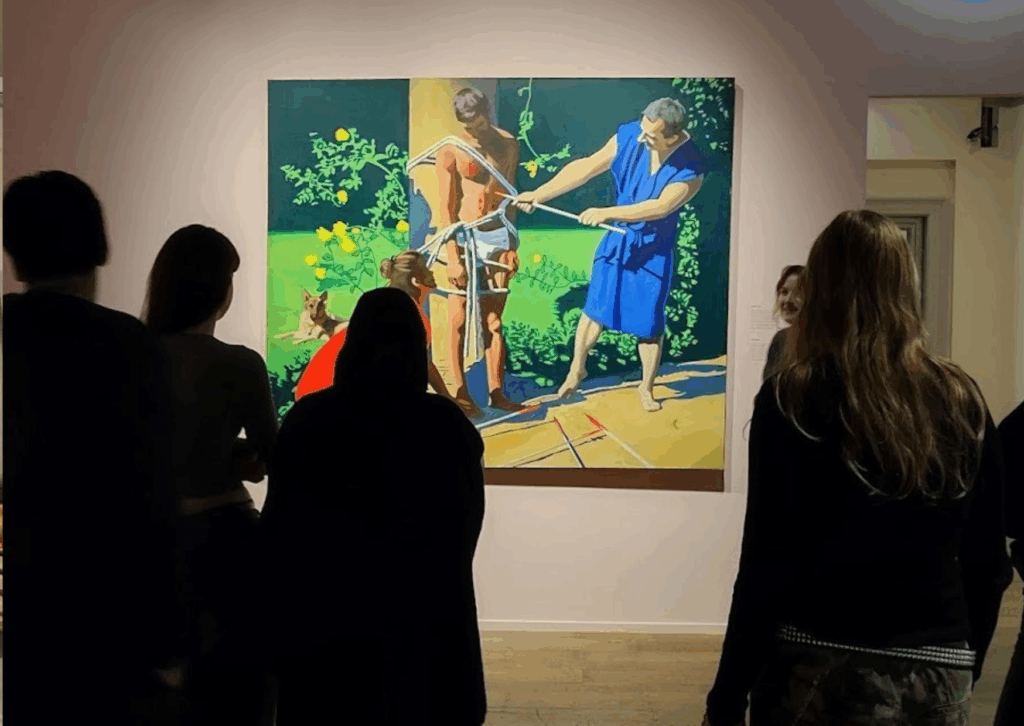In de tentoonstelling waren schilderijen, beelden en video-kunst te zien over verschillende aspecten van de liefde. De leerlingen keken en luisterden aandachtig. De rondleiding begon met het thema naastenliefde: hoe je iets voor een ander kunt doen zonder er iets voor terug te verwachten.