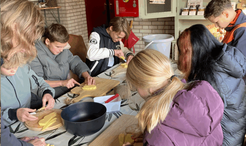 🥔 Aardappelverwerking: Een belangrijk onderdeel was het snijden van aardappelen tot friet. Met deze praktische oefening ontdekten de leerlingen hoe de ruwe grondstof (de aardappel) wordt voorbereid voor consumptie. De gesneden friet werd apart gehouden voor de afsluiting van de ochtend
